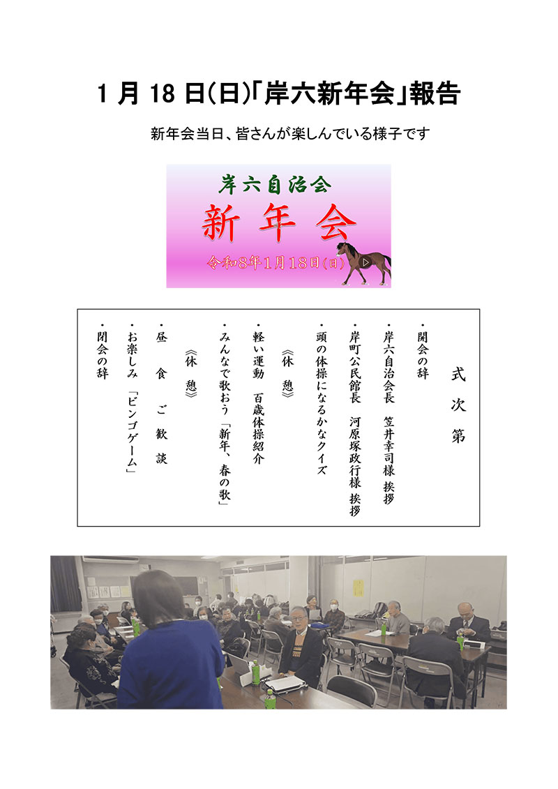 | 2026.01.05イベント | 岸六新年会 1月18日(日)10:00 岸町公民館第1・2講座室 |